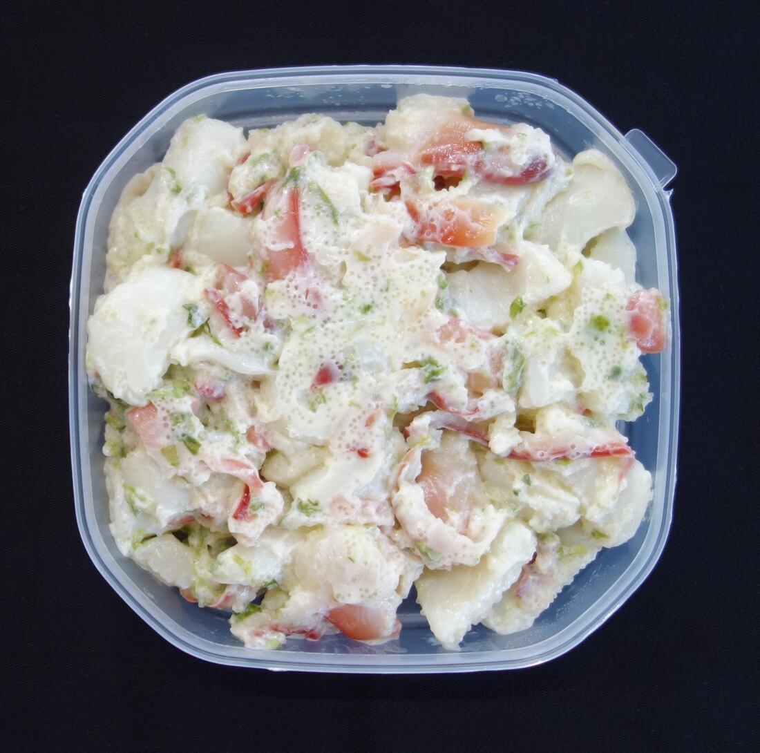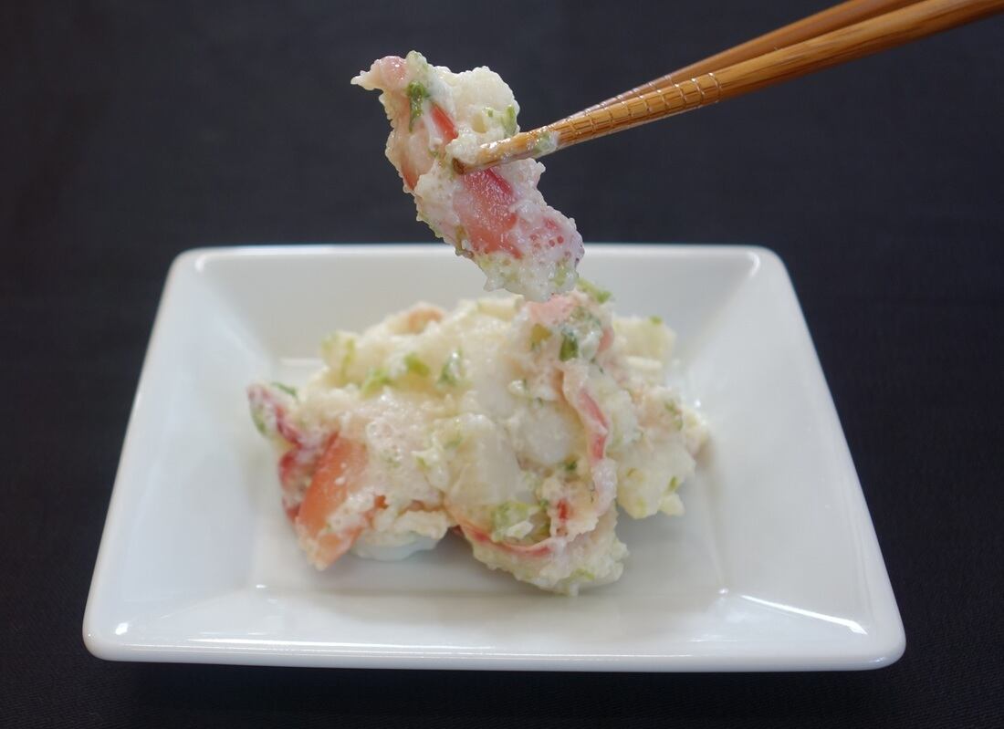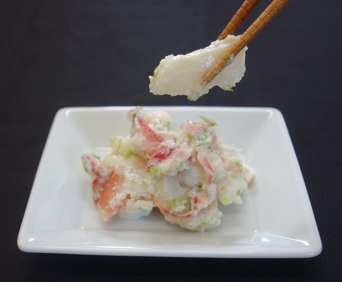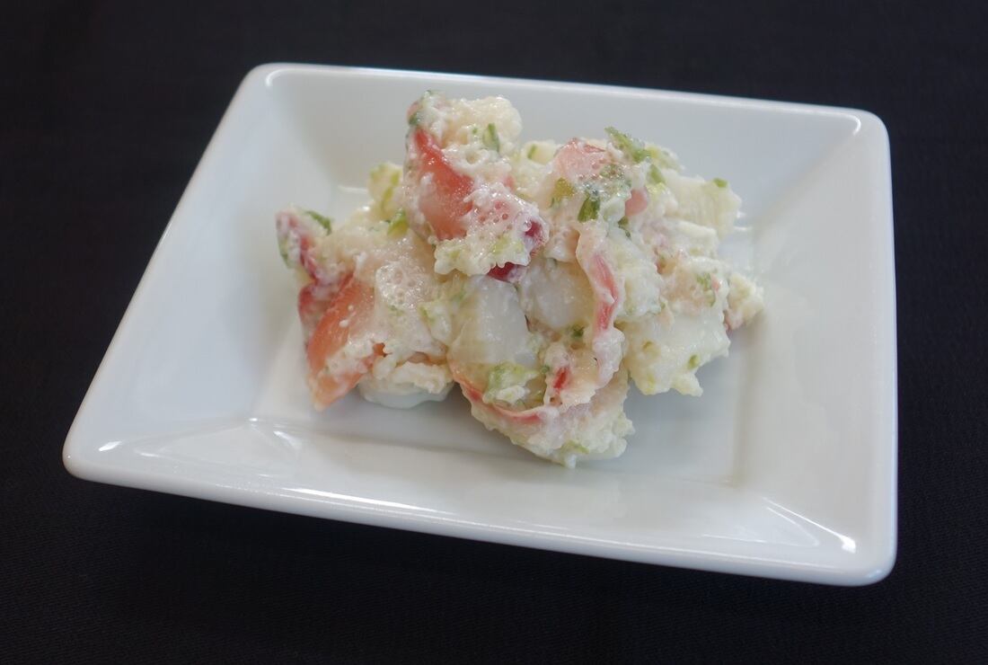 カナダ北寄貝が持つコリコリとした食感を残し、柔らかいいかを加え辛子マヨネーズで味付けした、ちょっと大人のおつまみです。