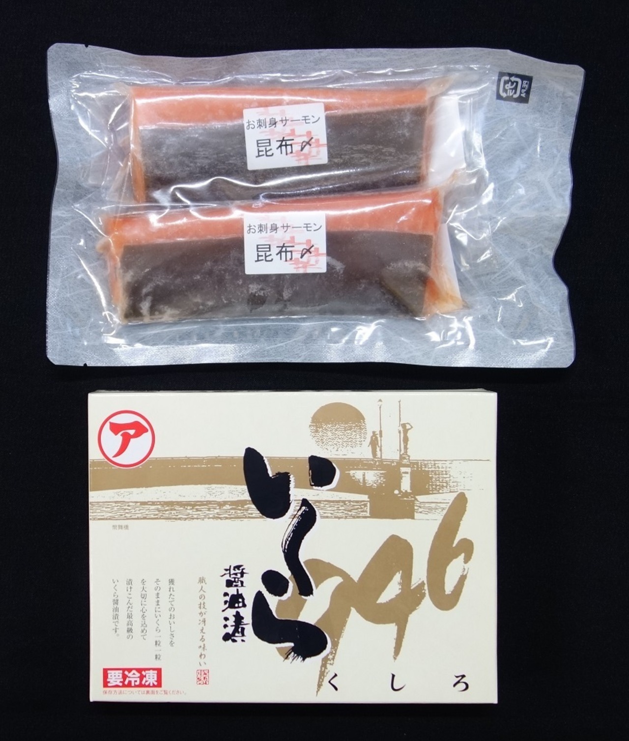 北海道近海で獲れた鮭の卵を使用したいくら正油漬(200g)と、刺身用の昆布締めサーモン(2柵・約350g)のセットになります。