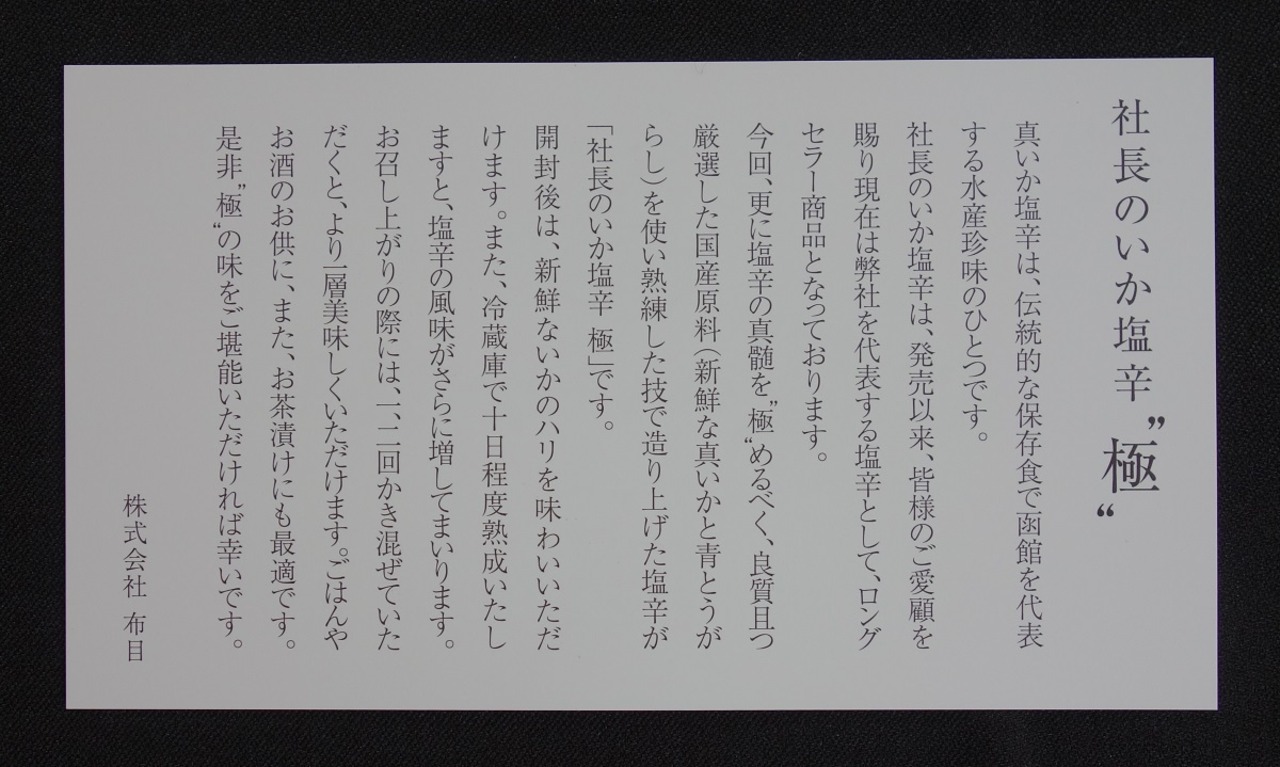 スルメイカ(国産)、いか肝臓、食塩、砂糖、みりん、青南蛮、たん白加水分解物(小麦・大豆を含む)、かつお節粉末、酵母エキス、かつおエキス / ソルビット、調味料(アミノ酸等)、酒精、増粘剤(キサンタンガム)