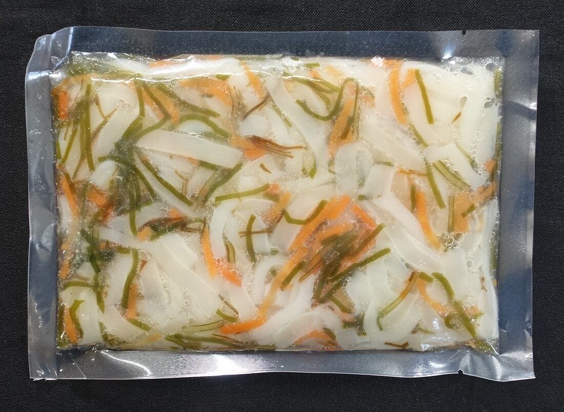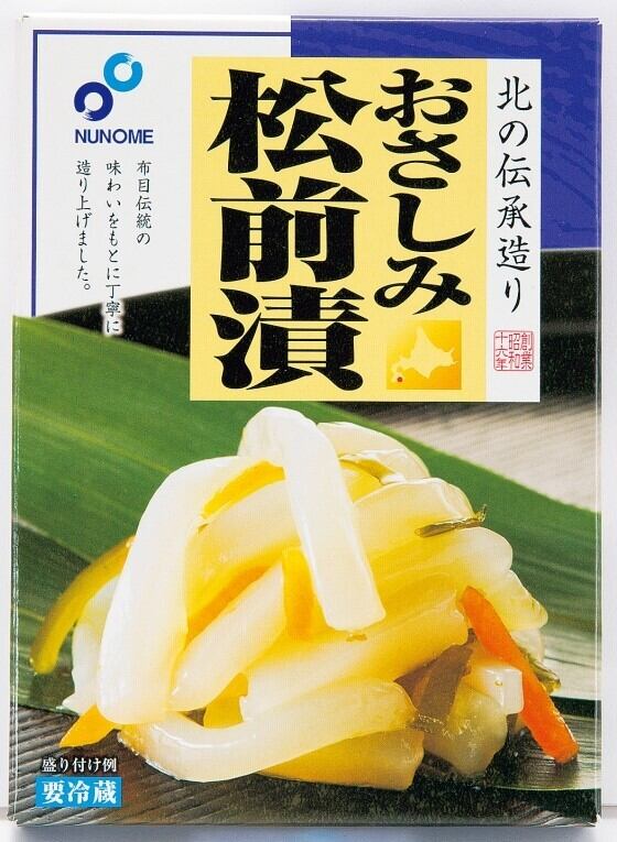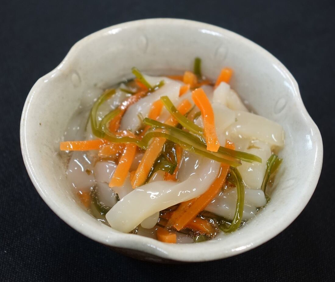 太切りの柔らかいいかと昆布を使用し、彩として人参を加え、白醤油で味付けしたおさしみ感覚で食べられる松前漬です。