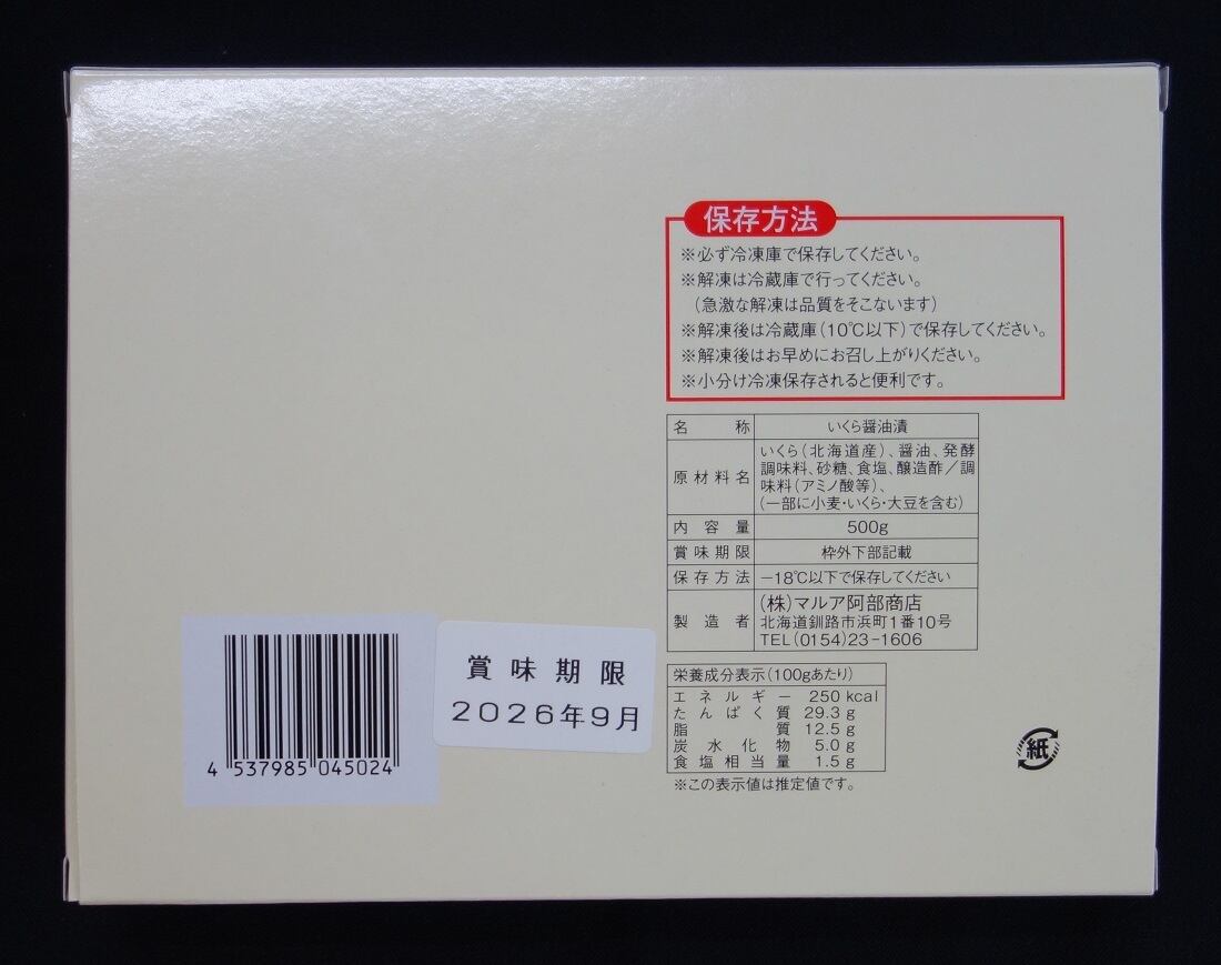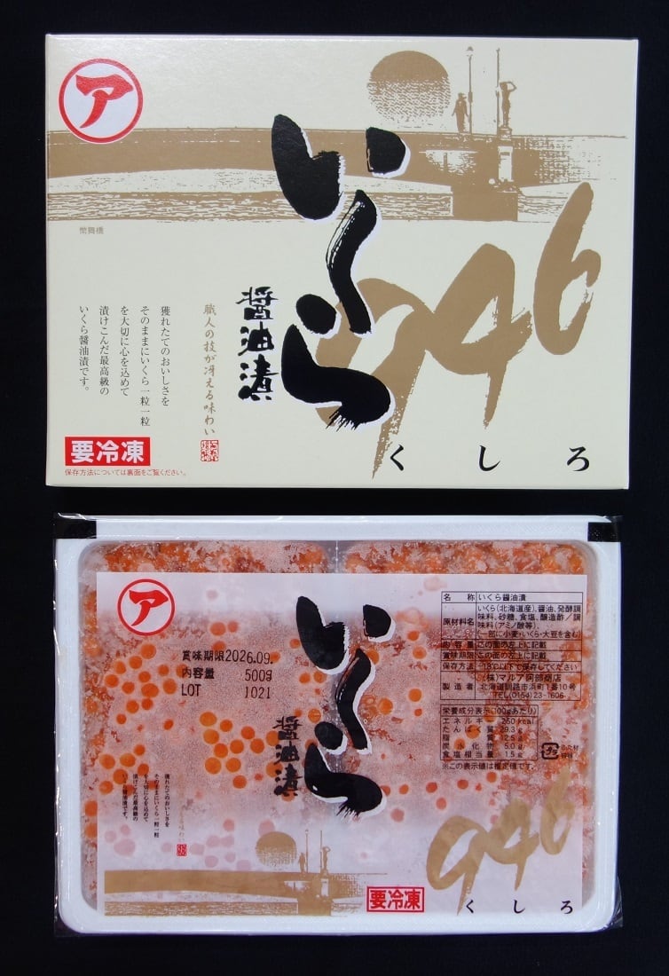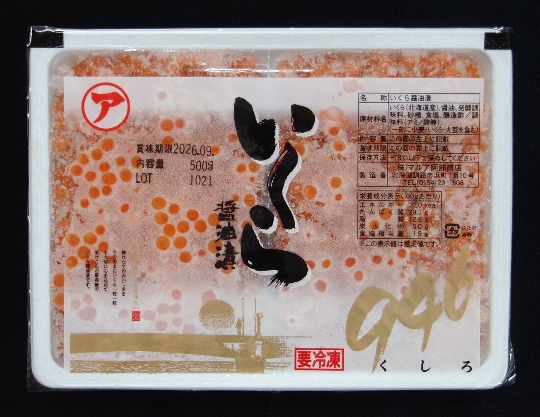 いくら(北海道産)、醤油、発酵調味料、砂糖、食塩、醸造酢/調味料(アミノ酸等)、(一部に小麦・いくら・大豆を含む)