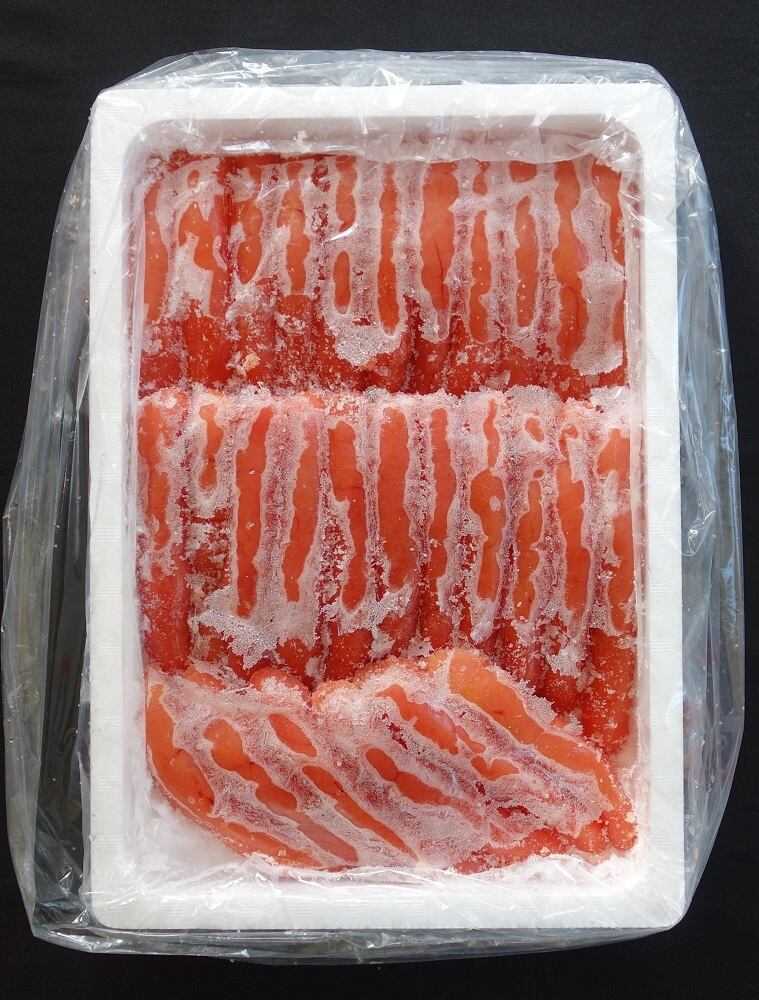 1腹(2本)が 約 100 ~ 120g 。たっぷり 2kg 入りの味わい深いたらこです。
