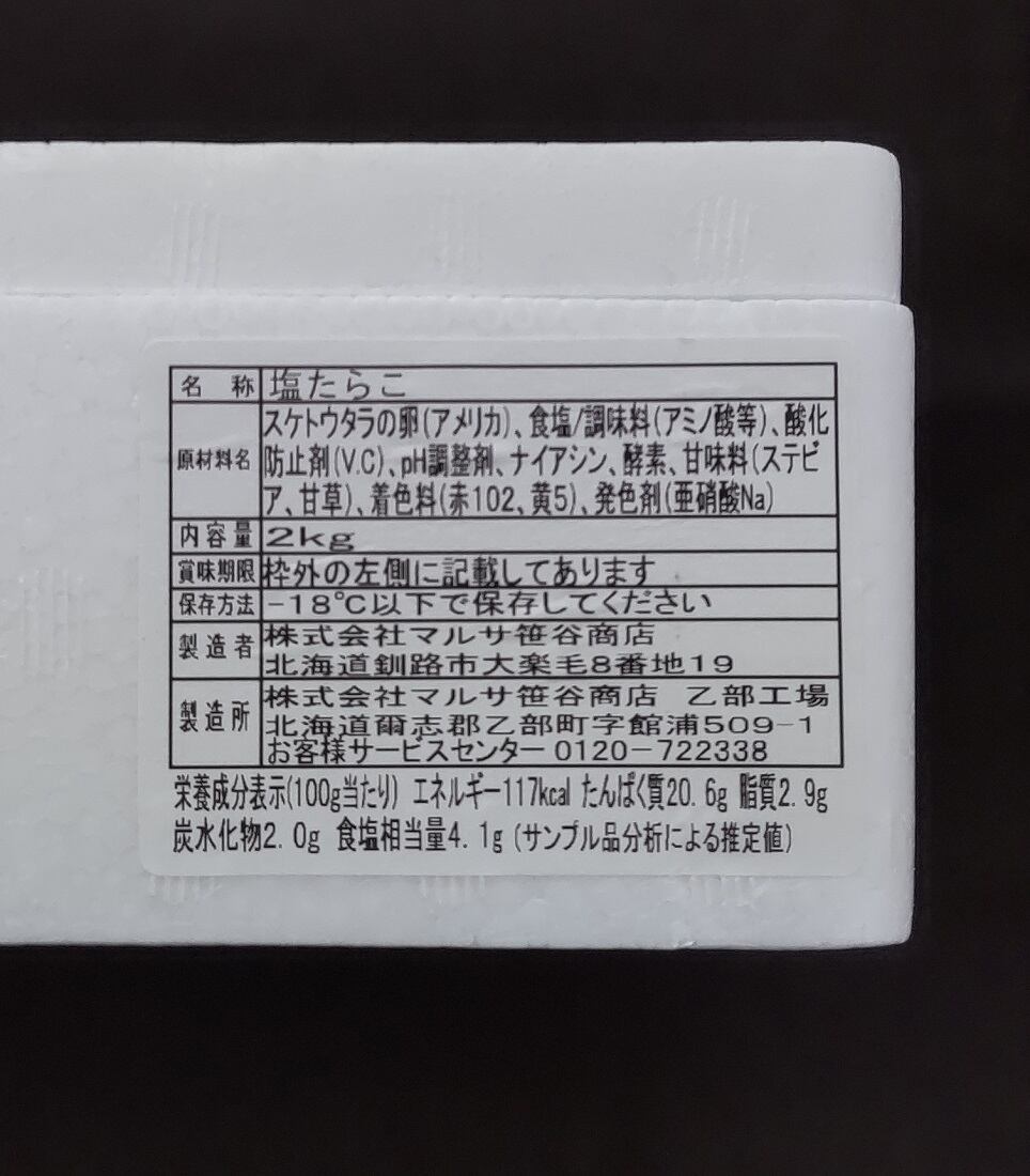 スケトウタラの卵(アメリカ)、食塩 / 調味料(アミノ酸等)、酸化防止剤(V.C)、pH調整剤、ナイアシン、酵素、甘味料(ステビア、甘草)、着色料(赤102、黄5)、発色剤(亜硝酸Na)